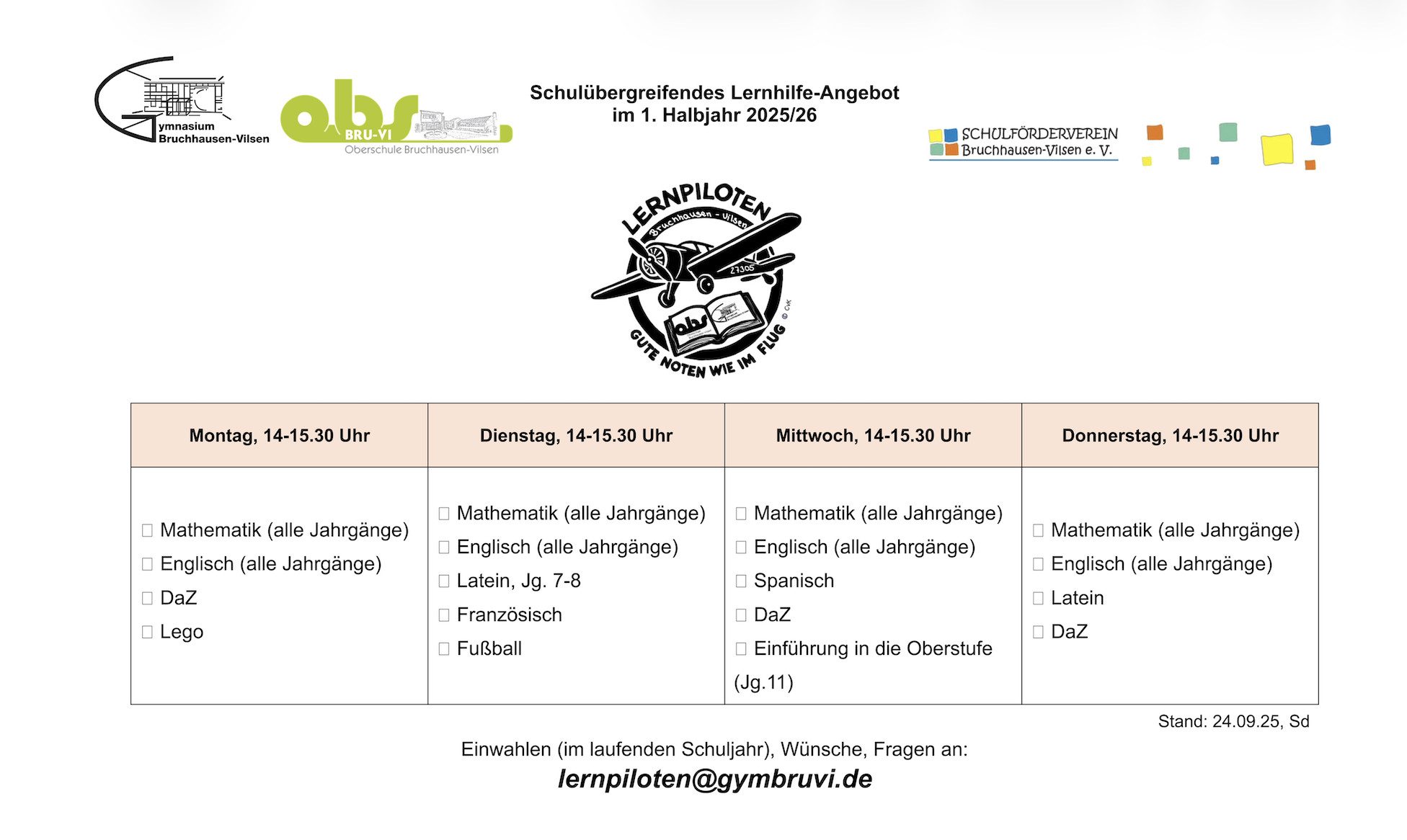 „Lernen für alle“ ist unser Motto. Damit die schülergeleitete Lernhilfe „Lernpiloten – Gute Noten wie im Flug“ stattfinden kann, braucht es eine gute Organisation. Du bist ein Organisationstalent, kreativ und engagiert? Dann werde ein Teil der Schülerfirma.