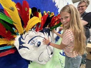 Der interaktive Banner wurde von den Besucher:innen gerne gestaltet. Hier sieht man eine kleine Kirchentagsbesucherin, wie sie eine Feder in die Mähne des 3D-Löwenkopfes steckt. Dieser strahlt Mut und Stärke aus und wächst mit jeder Feder, die die Besucher:innen ihm mitgeben.